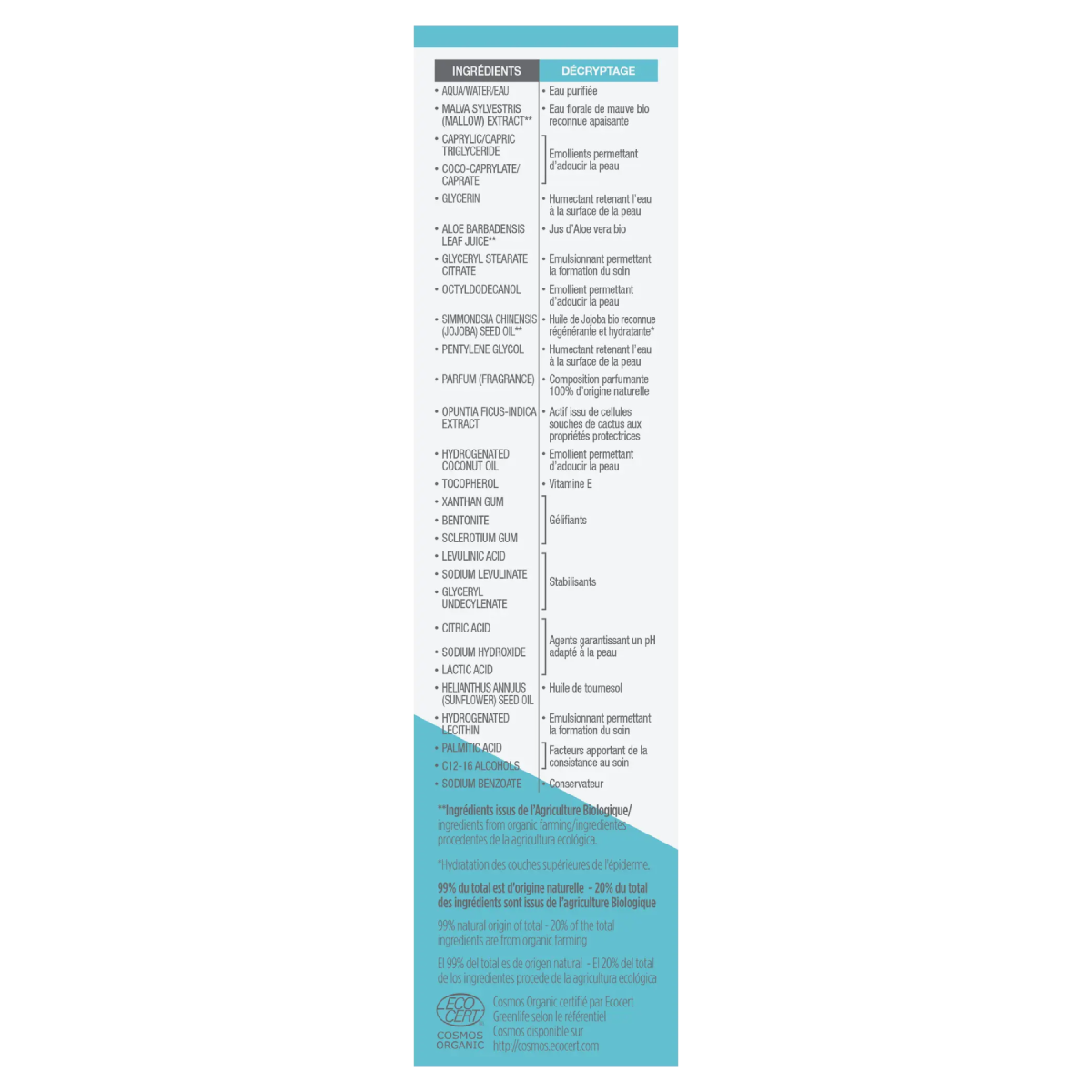 INCI : AQUA (WASSER), HORDEUM VULGARE EXTRACT*, GLYCERIN, CAPRYLIC/CAPRIC TRIGLYCERIDE, DICAPRYLYL CARBONATE, GLYCERYL STEARATE, MACADAMIA INTEGRIFOLIA SEED OIL*, CETEARYL GLUCOSIDE, CETEARYL ALCOHOL, PARFUM, SESAMUM INDICUM SEED OIL*, PRUNUS AMYGDALUS DULCIS OIL*, BENZYL ALCOHOL. *Inhaltsstoffe aus kontrolliert biologischem Anbau. 99 % der Gesamtinhaltsstoffe sind natürlichen Ursprungs. 80 % der Gesamtinhaltsstoffe stammen aus kontrolliert biologischem Anbau.