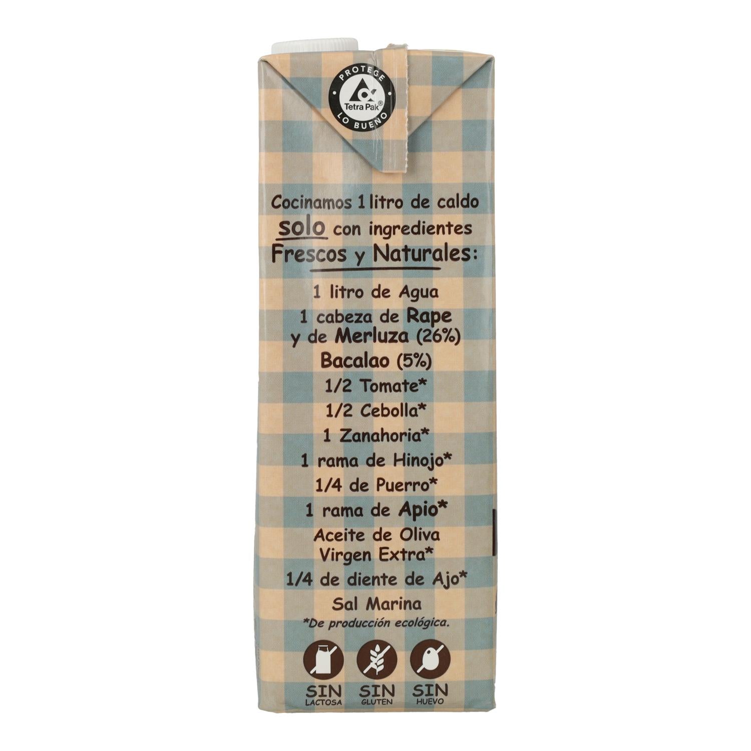 Wasser, Seeteufel (26 %), Kabeljau (5 %), Zwiebeln*, Karotten*, Tomaten*, Fenchel*, Lauch*, Sellerie*, Knoblauch*, natives Olivenöl extra*, Meersalz. (*Zutaten aus biologischem Anbau)