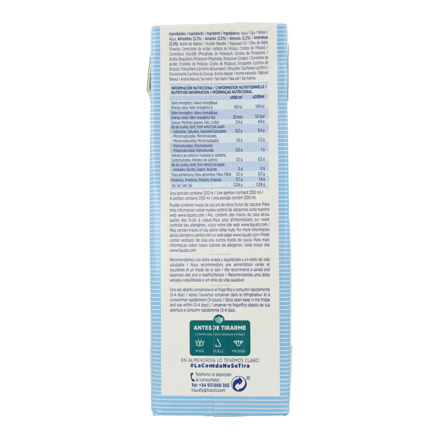 Ingredientes: Agua, almendra (2.2%), aceite de colza, correctores de acidez fosfatos de potasio, citratos de potasio). emulgentes (lecitina de girasol), aroma natural y sal.