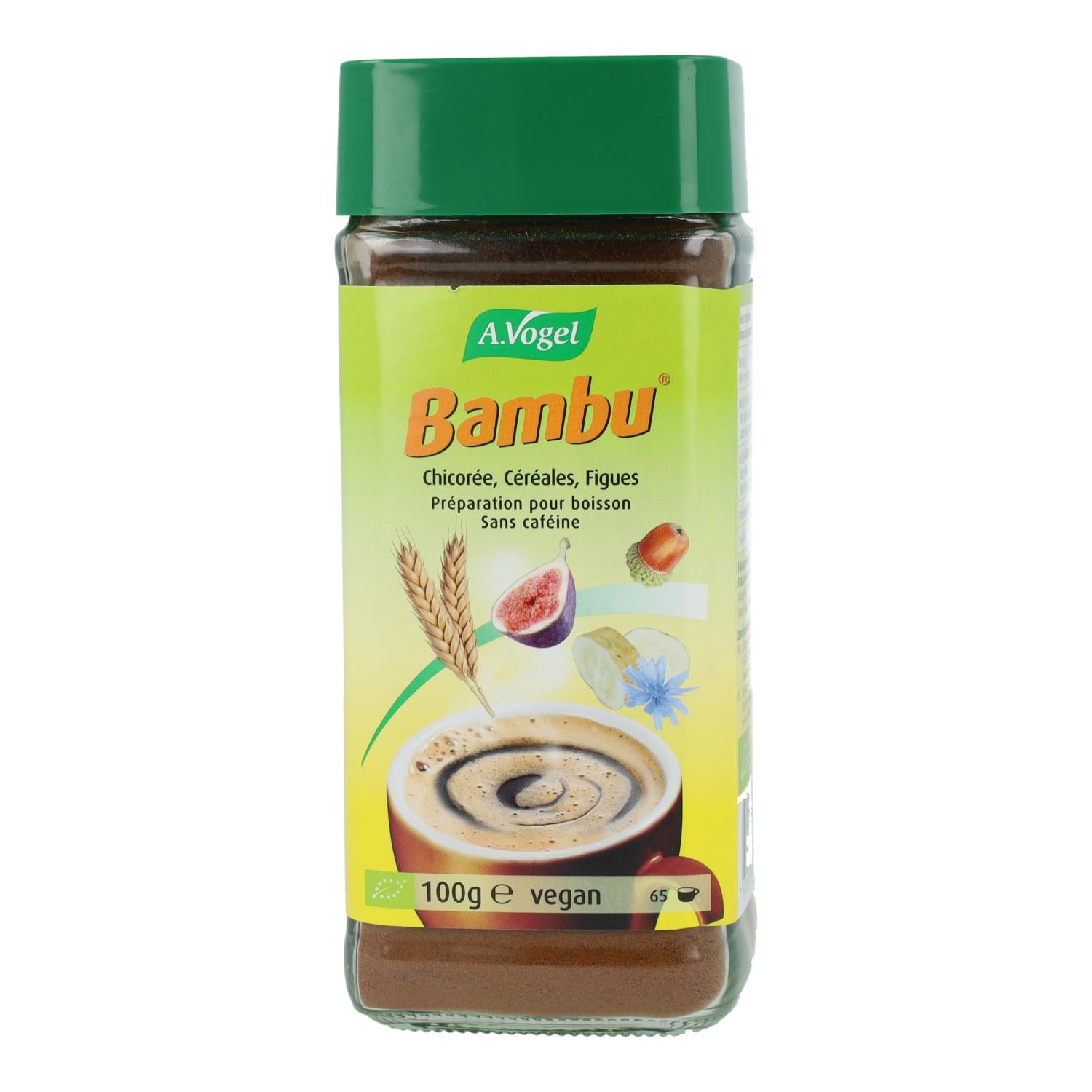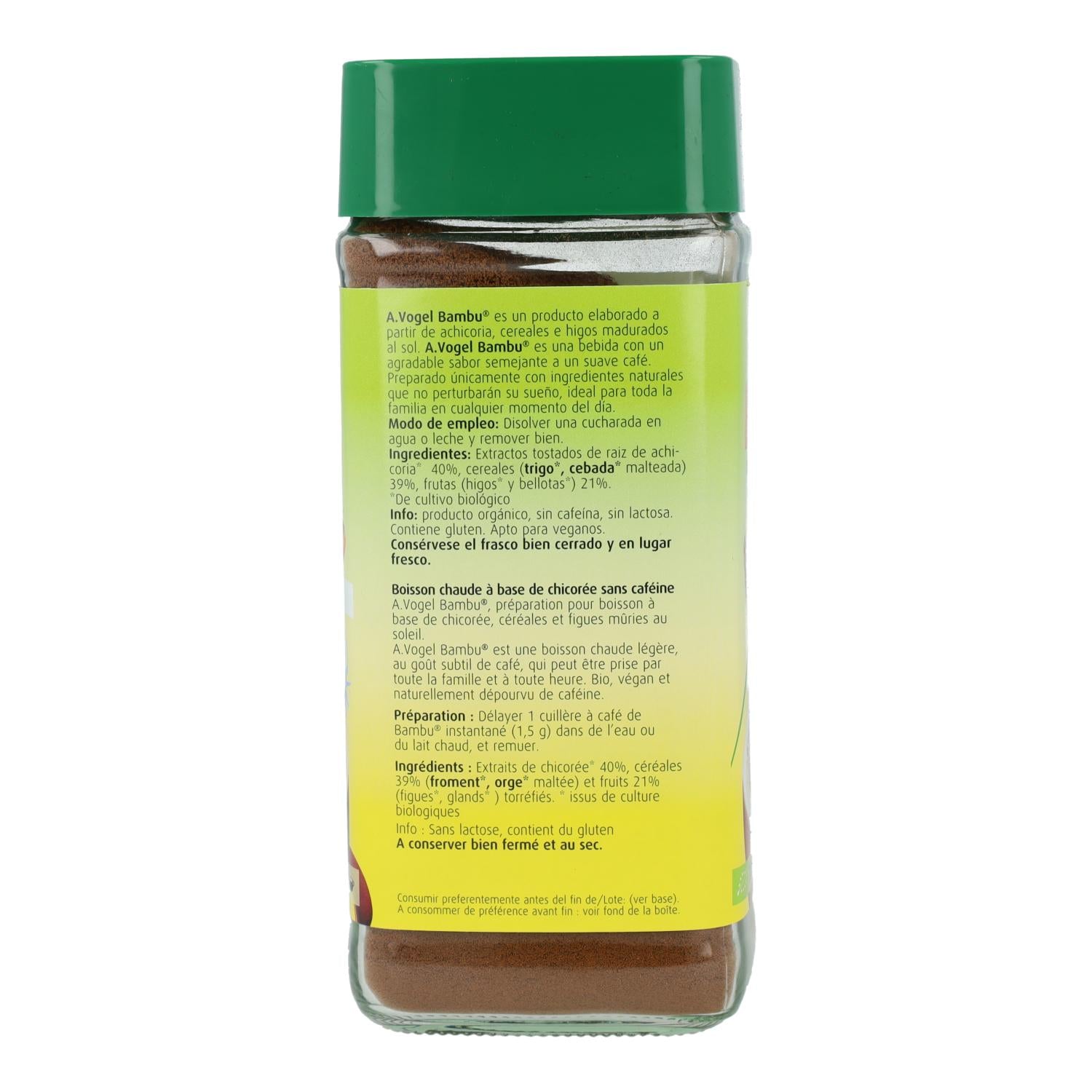 A.Vogel Instant Bamboo est une boisson soluble 100 % naturelle, élaborée à partir de céréales, de fruits et de chicorée issus de l'agriculture biologique. Son arôme et sa saveur incomparables rappellent les meilleurs cafés torréfiés au monde. Sans caféine, elle ne perturbera pas votre sommeil. Savourez-la à tout moment, nature ou avec du lait, pour un petit-déjeuner gourmand. Convient également aux enfants. Instantanée, elle se dissout aussi facilement dans du lait froid (soja, avoine ou riz). Idéale pour une boisson rafraîchissante en été.
