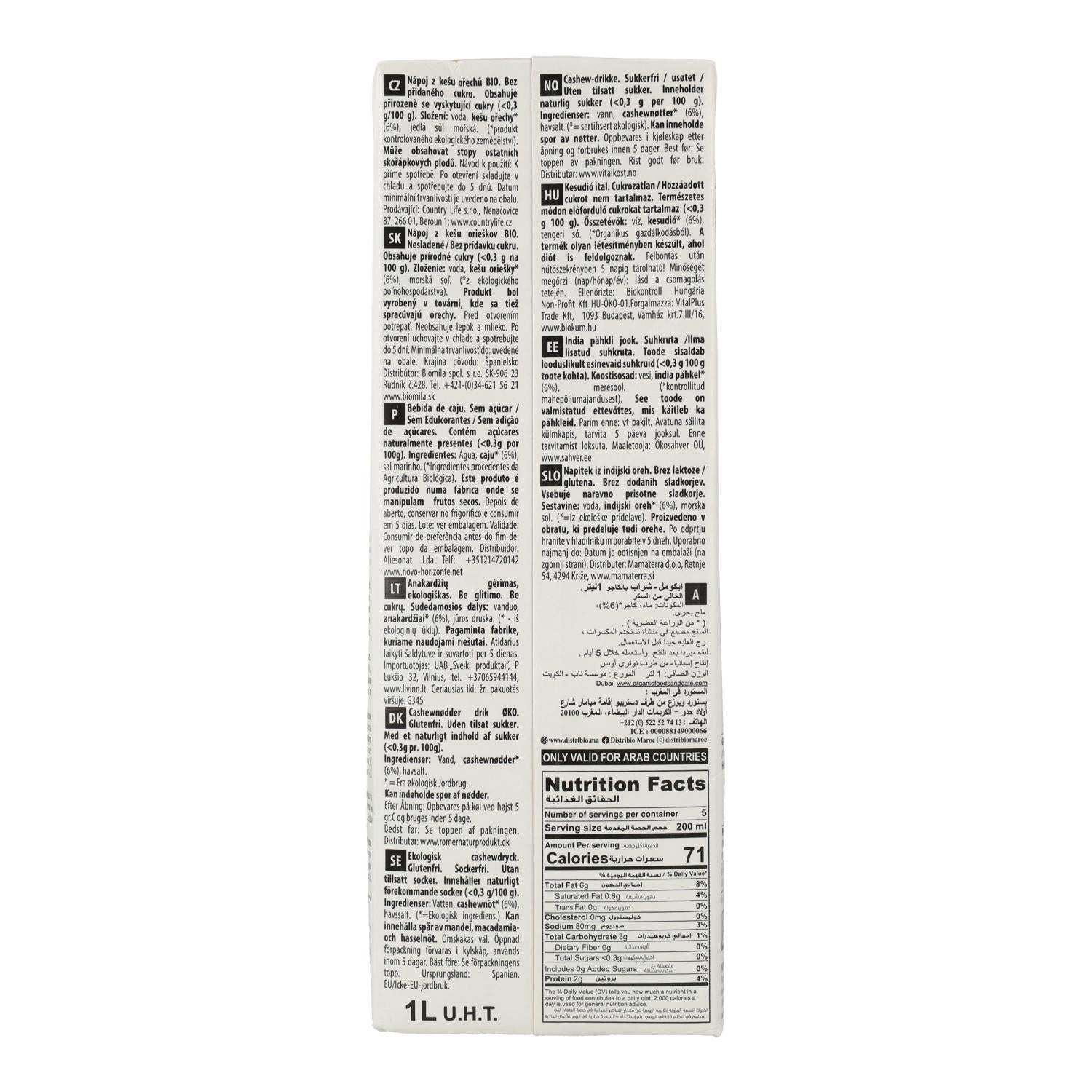 Ingrédients : Eau, noix de cajou* (6 %), sel marin. *Ingrédients issus de l'agriculture biologique. Ce produit est fabriqué dans un atelier qui transforme également des noix.