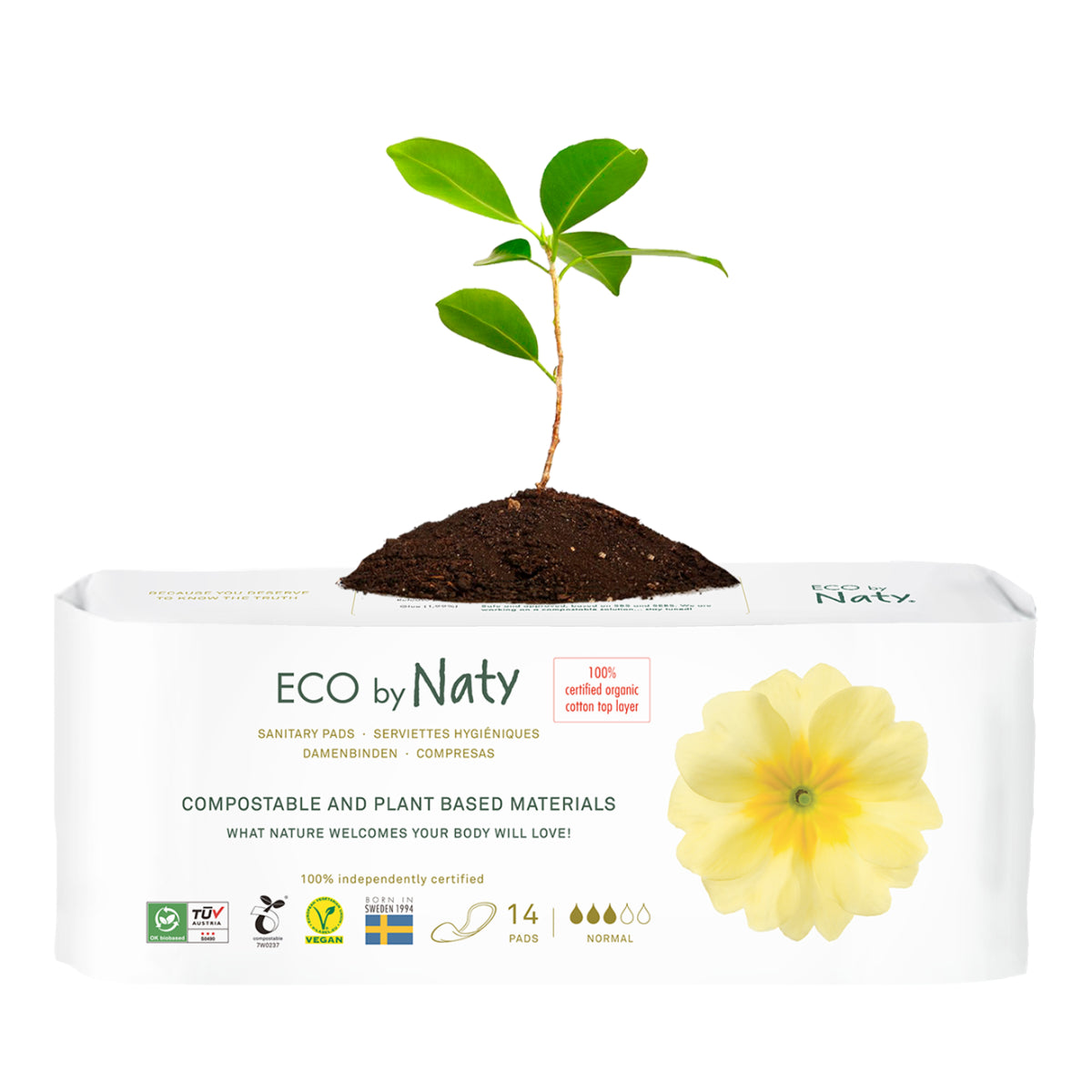 Eco by Naty est la première et unique gamme de produits d'hygiène féminine et d'incontinence dont les matières premières sont certifiées 100 % compostables, y compris l'emballage individuel et le conditionnement.