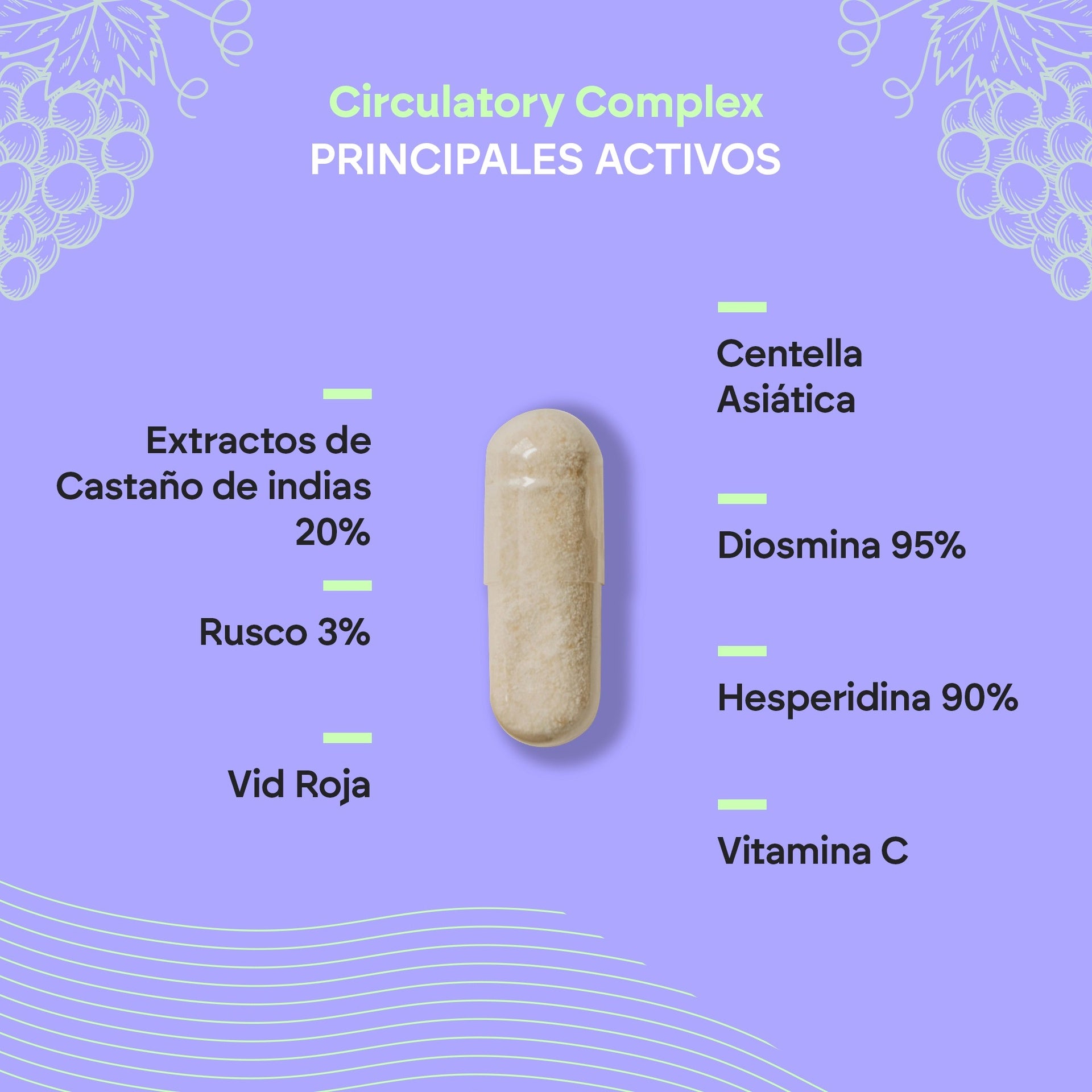 Diosmine, extrait sec de graines de marron d'Inde ( Aesculus hippocastanum L.) 20 % d'escine, extrait sec de feuilles de vigne rouge ( Vitis vinifera L.) 5 % de polyphénols, agent d'enrobage (hydroxypropylméthylcellulose), extrait sec de racine de petit houx ( Ruscus aculeatus L.) 3 % de ruscogénine, extrait sec de parties aériennes de gotu kola ( Centella asiatica (L.) Urb.) 3 % d'asiaticosides, hespéridine, vitamine C (acide L-ascorbique), agents antiagglomérants (dioxyde de silicium, sels de magnésium d'acides gras), agent de charge (cellulose microcristalline).