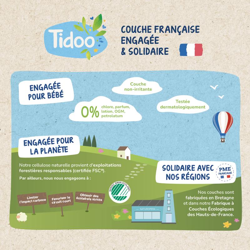 Le couches produits jetables écologiques Les couches jetables Tidoo sont fabriquées En France, ils sont biodégradables à 50 % . qui répondent aux exigences des parents et de la planète.