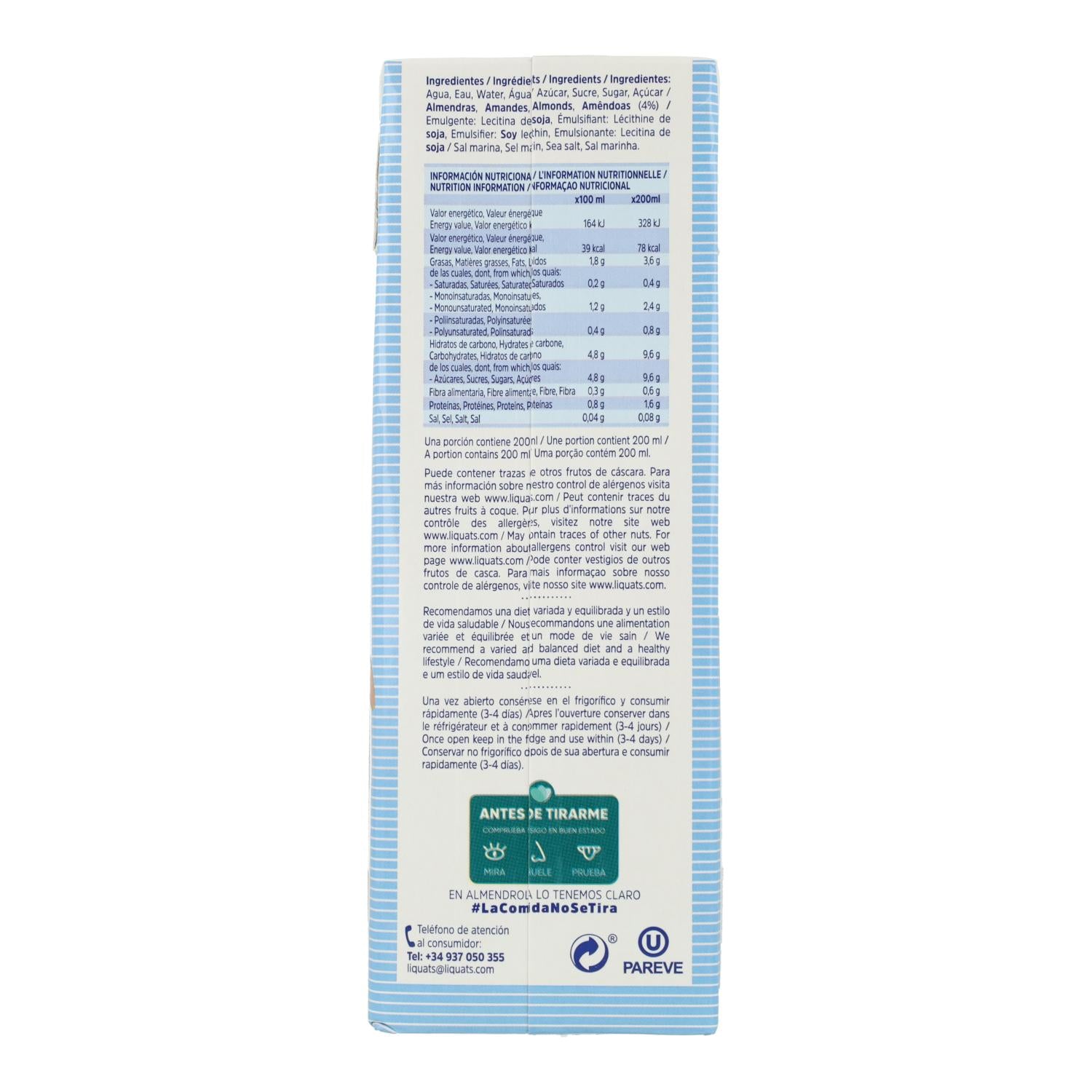 Zutaten: Wasser aus Montseny, Zucker, Mandeln (4 %), Emulgator: Sonnenblumenlecithin und Meersalz. Allergene : Mandeln. Kann Spuren von Soja und/oder anderen Nüssen enthalten.