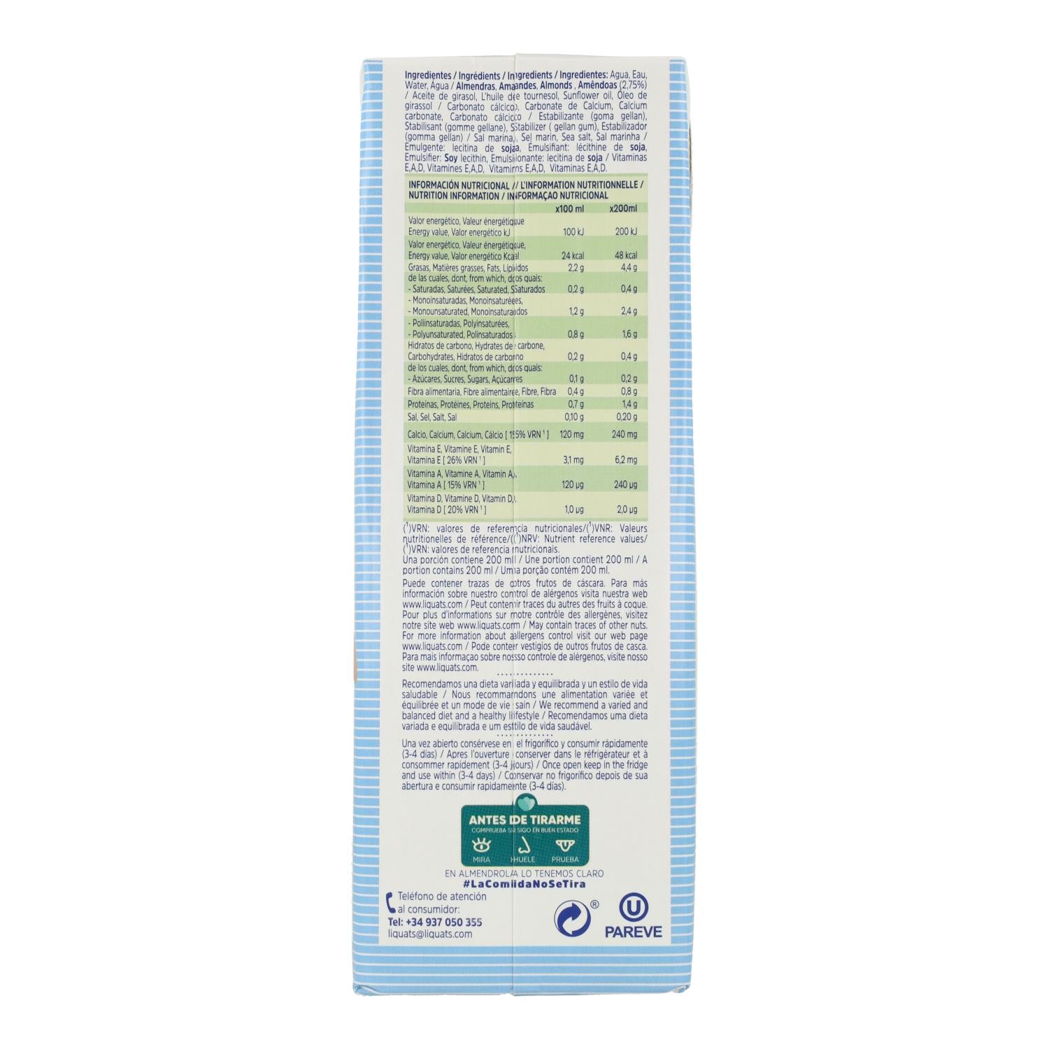 Zutaten: Wasser aus Montseny, Mandelöl (2,75 %), Sonnenblumenöl, Carbonat Calcium, Gellangummi, Emulgator: Sonnenblumenlecithin, Meersalz, Vitamine A, D und E. Allergene: Mandeln, kann Spuren von Soja und/oder anderen Nüssen enthalten.