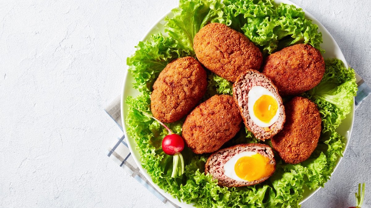 - Die hartgekochten Eier gleichmäßig mit Mehl bestäuben. Die Hälfte der Fleischmischung um ein hartgekochtes Ei verteilen und gleichmäßig verteilen. Das Ei in verquirltem Ei wenden und anschließend in Paniermehl wälzen, bis es vollständig bedeckt ist. Diesen Vorgang mit dem anderen Ei wiederholen.