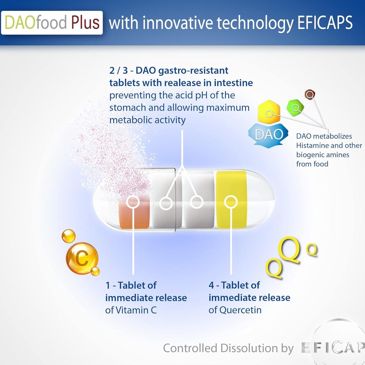 • Jede Kapsel enthält: 2 magensaftresistente DAO-Pellets, 1 Vitamin-C-Pellet, 1 Quercetin-Pellet