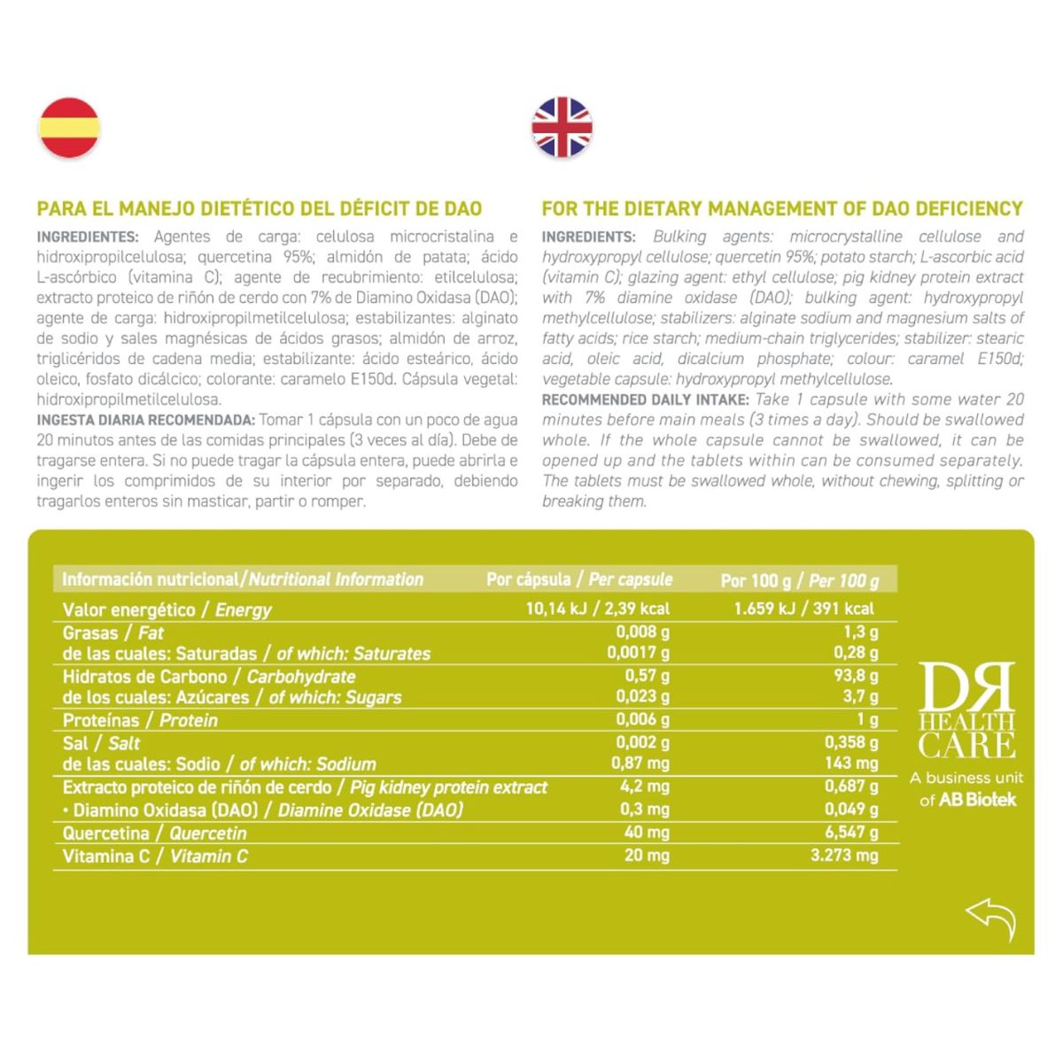 • Schweinenierenproteinextrakt mit 7% DAO (0,3 mg DAO-Enzym pro Kapsel).