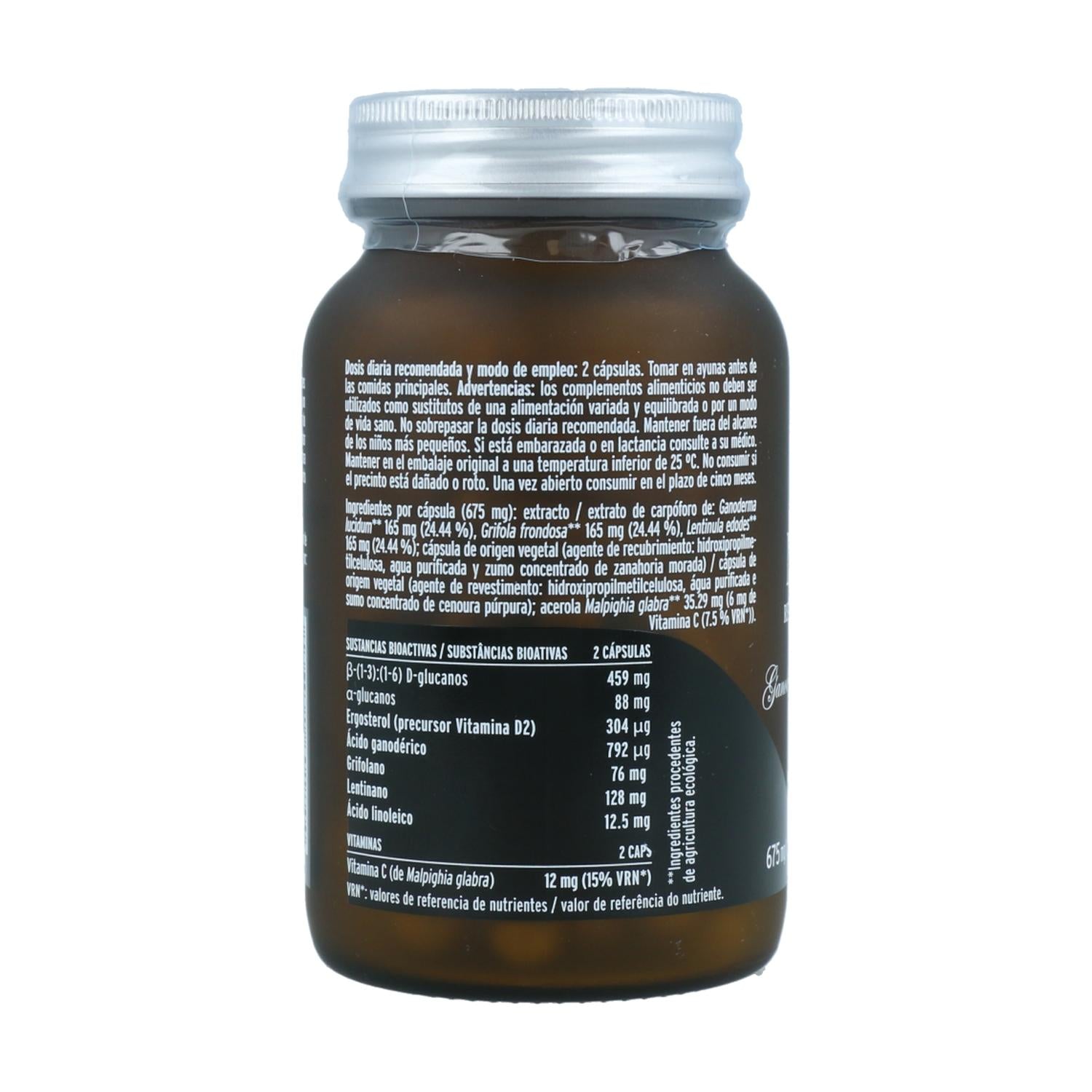 Zutaten pro Kapsel (675 mg): Fruchtfleischextrakt/Extrakt aus: Ganoderma lucidum 165 mg (24,44 %), Grifola frondosa 165 mg (24,44 %), Lentinula edodes 165 mg (24,44 %); Kapsel pflanzlichen Ursprungs (Überzugsmittel: Hydroxypropylmethylcellulose, gereinigtes Wasser und konzentrierter Saft violetter Karotten) / Kapsel pflanzlichen Ursprungs (Überzugsmittel: Hydroxypropylmethylcellulose, gereinigtes Wasser und hochkonzentrierter Saft violetter Karotten); Acerola Malpighia glabra 35,29 mg (6 mg Vitamin C (7,5 % NRV)).
